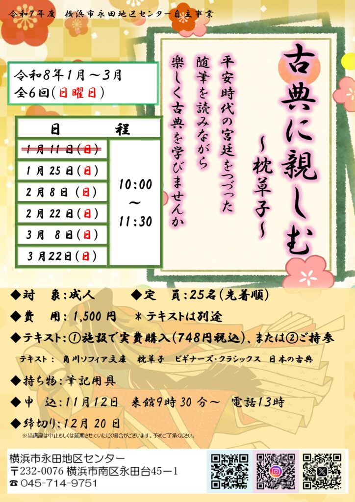 1月11日(日)から開催を予定しておりました「古典に親しむ~枕草子(全6回)」は講師の先生の事情により、第1回を1月25日(日)に変更させていただきました。また、1回分については別途お知らせいたしますが振替となります。