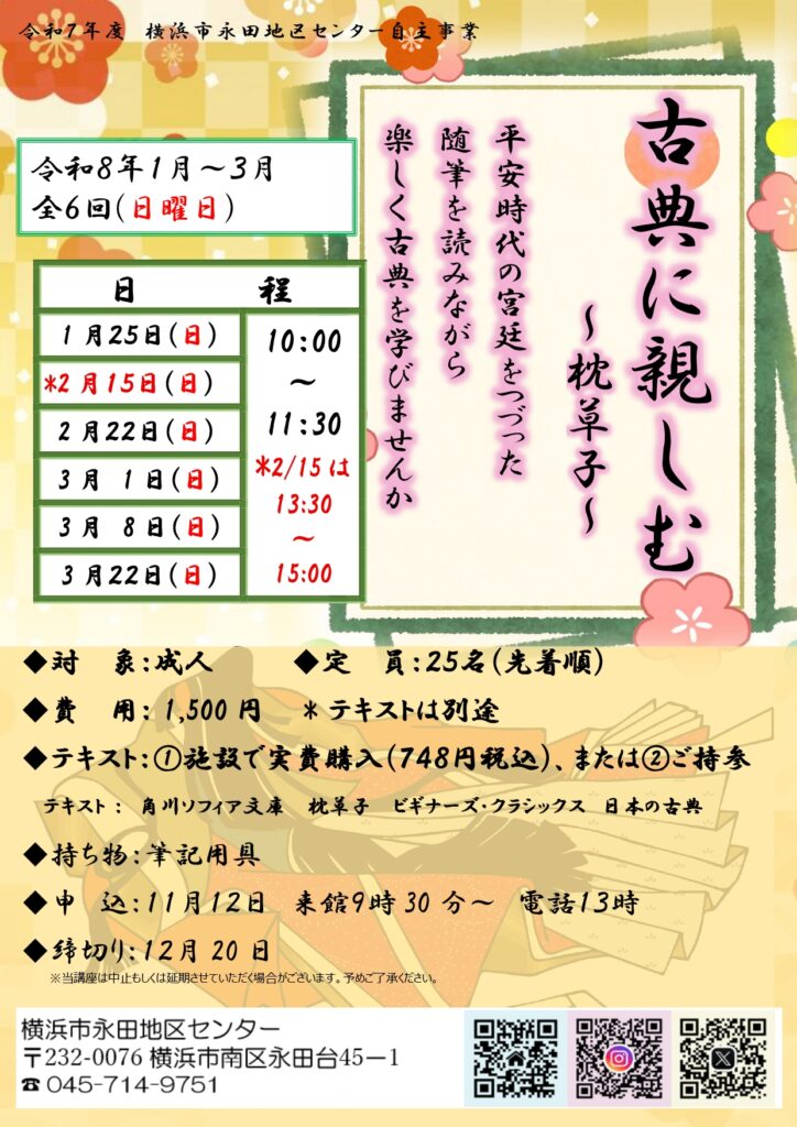 2月8日(日)に開催を予定しておりました「古典に親しむ~枕草子~」(第2回)は雪予報のために、 日時を2月15日(日)の13:30~15:00に変更させていただきました。