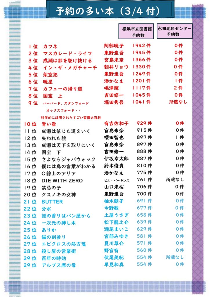 人気の本が永田地区センターでは、はやくご利用いただけます