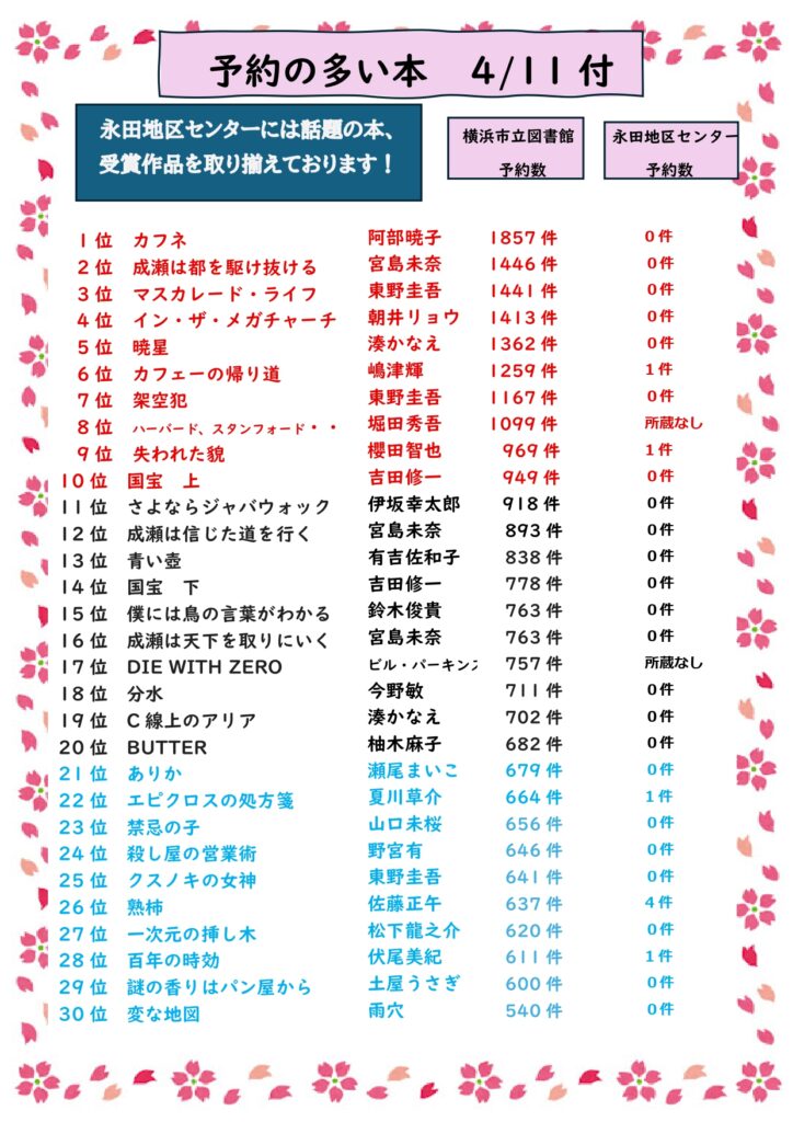人気の本が永田地区センターでは、はやくご利用いただけます