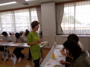 実際の様子 | 9/10(水)「秋のリースづくり」を実施し11名の方にご参加いただきました。講師は南区街の先生としてご活躍されている手老和子先生です。 手老先生手作りの土台へ1本1本丁寧に装飾されたリボン、紫陽花やバラのプリザーブドフラワー、色とりどりの造花でリースを飾り付けてます。材料は同じですがそれぞれ個性のある素敵なリースができあがりました。 9月に入りましたが残暑厳しいです。季節感あふれる秋のリースでお部屋を飾っていただければと思います。ご参加いただいた皆様ありがとうございました。