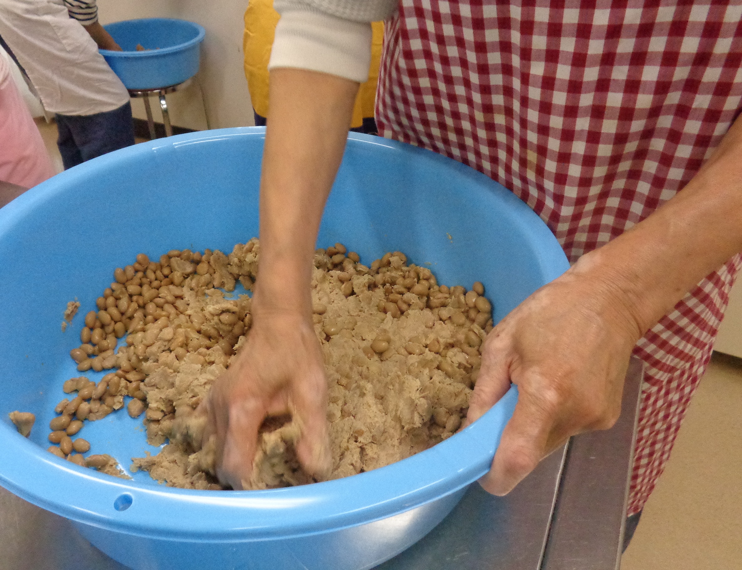 | 実際の様子 | 「本格味噌作り~秋~」は10月25日(土)に「米みそ作り」を開催しました。講師は川口糀店の川口先生です。今回も申込み開始とともに定員に達しキャンセル待ちとなりました。春と秋の年2回開催していますが毎回ご参加される方も多く、皆さん手際よくお味噌作りの工程を進めていきます。 大豆を潰し塩と糀を混ぜ出来上がった味噌玉はすでに美味しそうです!容器へ丁寧に味噌玉を入れきらきら光る塩の結晶、滑らかな表面、ひとつひとつの工程に愛情がつめこまれていくようです。 味噌は、発酵食品として腸内環境を整え、免疫力アップや美肌、がん予防、ダイエットにも効果が期待できる優れた食材です。出来上がりの1年後が楽しみです。 ご参加いただいた16名の方々ありがとうございました。