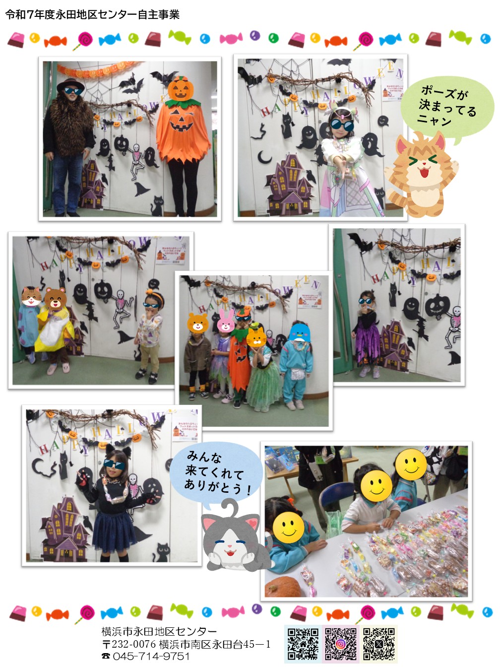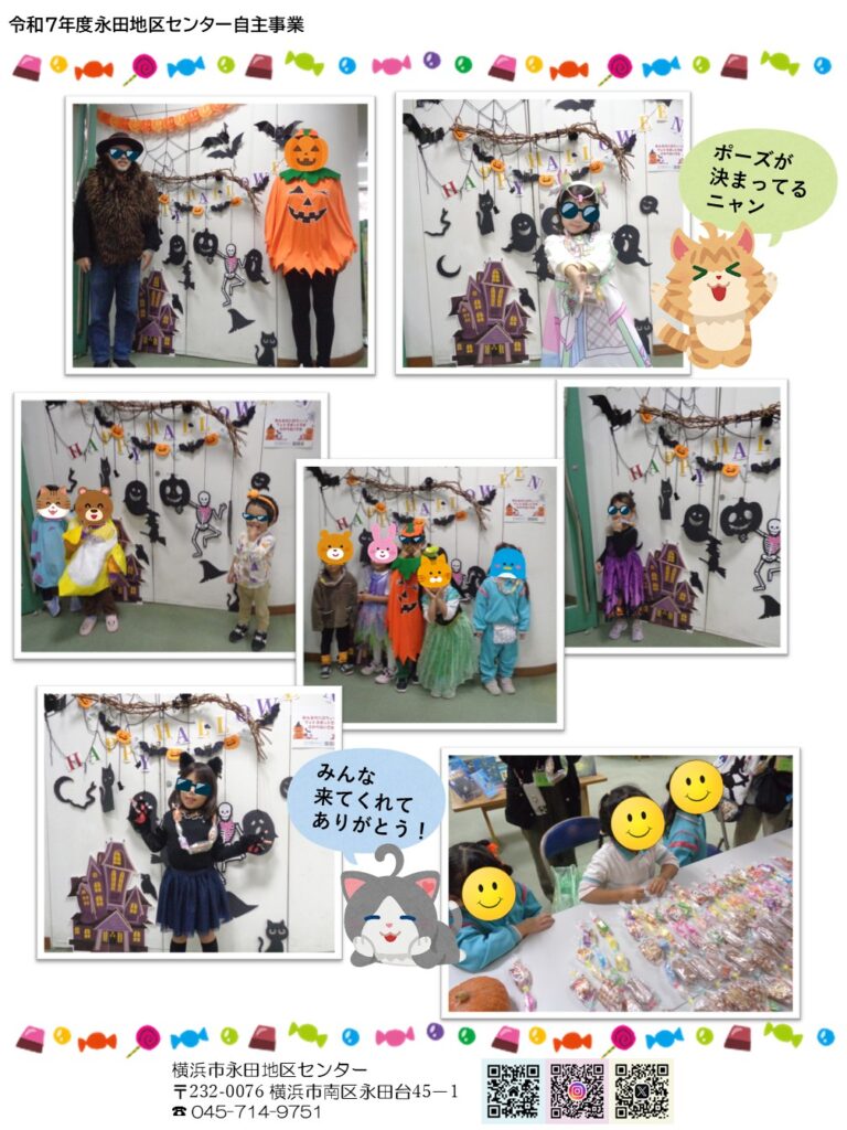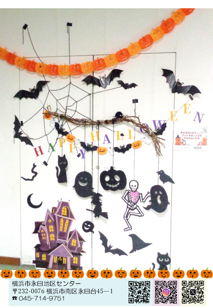 本日『ハロウィーンで仮装してキャンディレイを作ろう』を実施しました。可愛いモンスター達が永田地区センターに勢ぞろい!!ありがとうございました。ハロウィーンのフォトスポットで写真撮影いかがでしょうか?